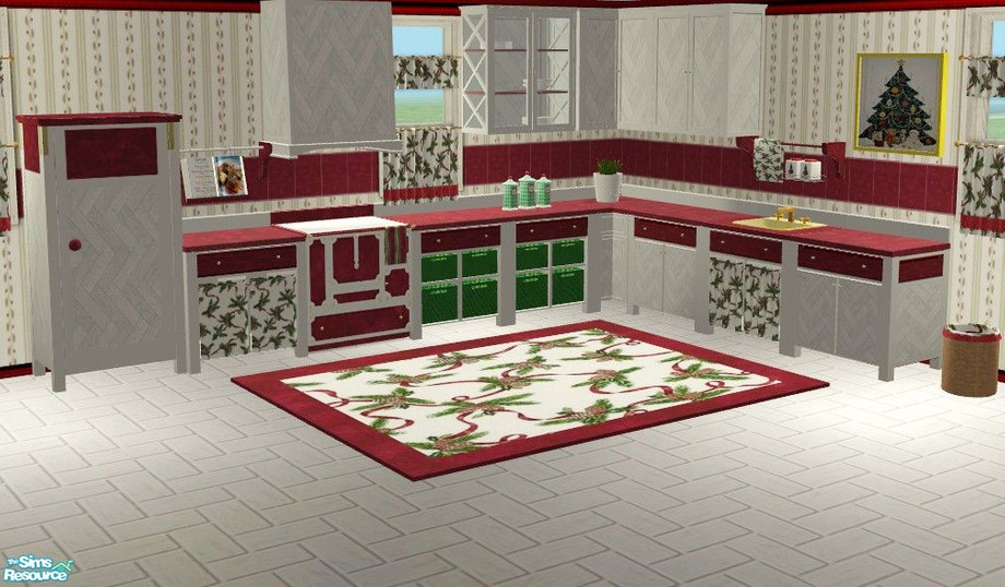 Beautiful Holiday Kitchen featuring pine boughs, and silver, white and cranberry colors. Ready for your sims\' holiday baking! By Riverwillows