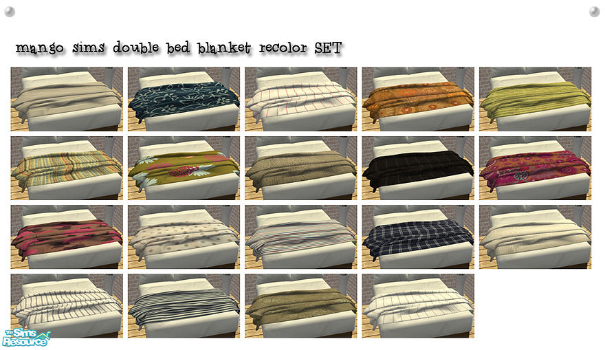 The same recolors as my previous mangosims \"Duo\" bed blanket, but these are for double beds. Enjoy