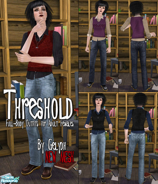 New full-body mesh for adult females with button-up dress shirt and sweather vest, with jeans and boots. Comes in three recolors in varying hues and textures. Mesh is base game compatible.
