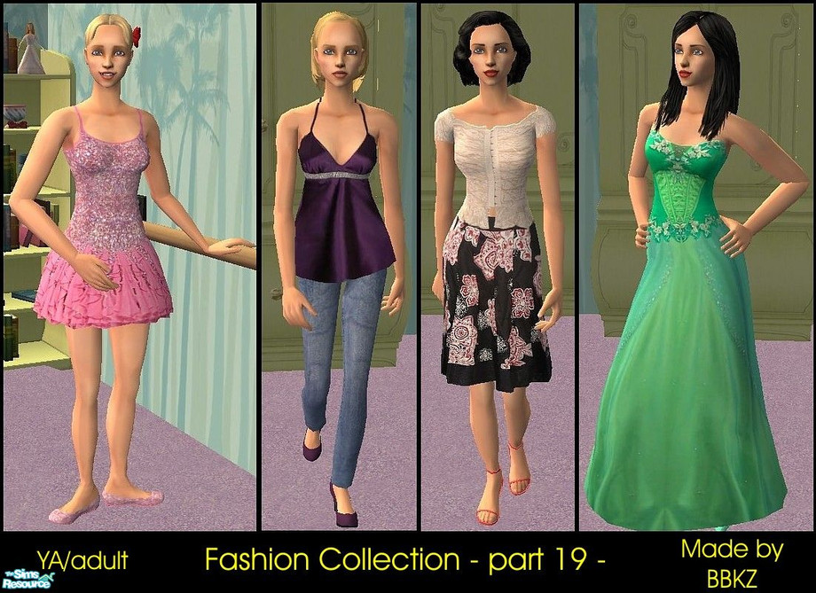 Here it is: 19th part of beautiful and stylish outfits for your sim ladies. This new set includes: 2 everyday clothes, 1 prom dress and 1 formal mini dress which you can use as athletic (for ballet) outfit... No EP required! Meshes are FREE (see Notes)... Enjoy! :-)