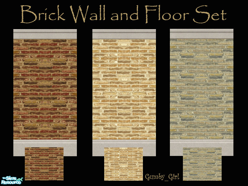 A set of three brick walls with matching brick floors. 1 dark brown, red, light brown brick wall. 1 light brown, cream brick with mocha brown bricks. 1 light brown with grey and blue coloured bricks with cement coloured quoining. Brick floors great for paths and courtyards.