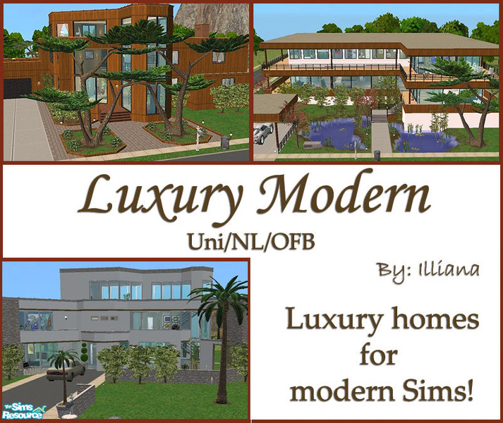 3 sweet luxury modern homes! - All fully furnished - All Maxis only (no custom content) - All Uni/NL/OFB - All are fully landscaped and tested in-game. Just load them up and you are ready to play!