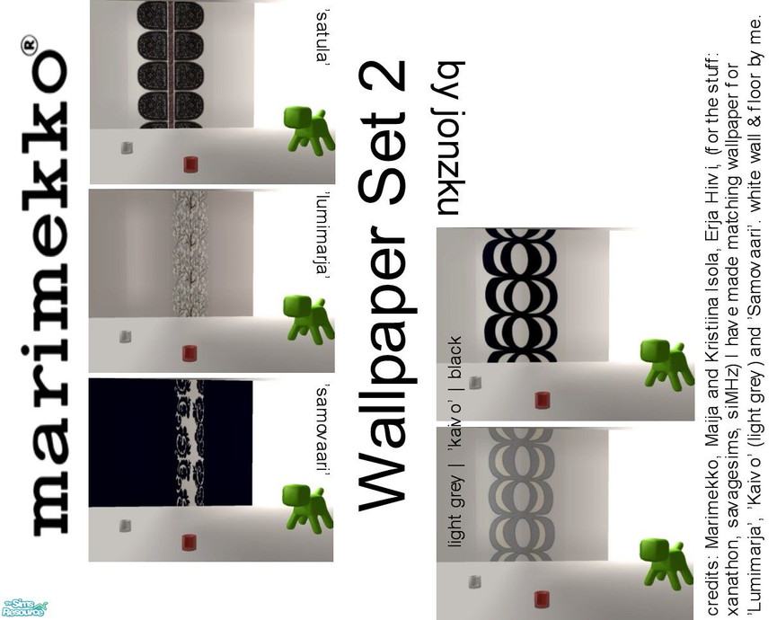 This set contains 11 walls (of which 3 matching). I made walls from Maija and Kristiina Isola\'s and Erja Hirvi\'s fabrics. Bring some Finnish design to your sims\' homes! Hope you like these :D