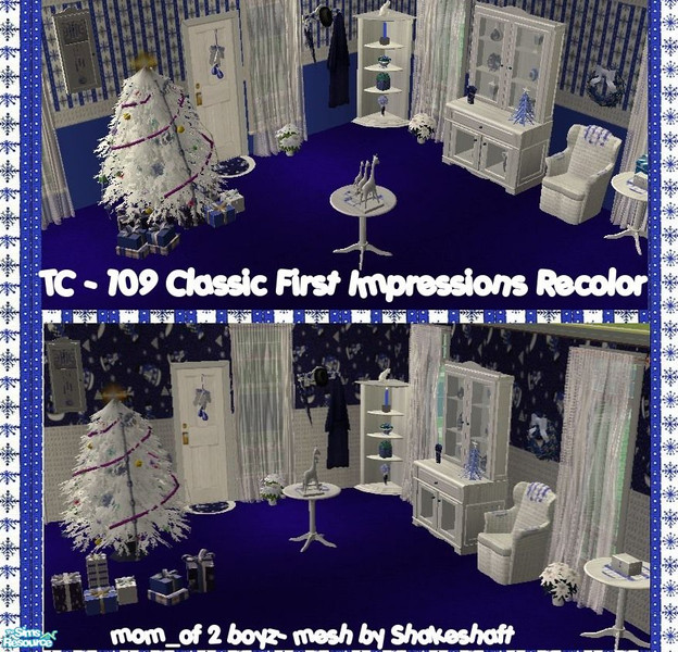 This is a recolor of Shakeshafts Classic First Impressions Hallway, done for TC109. The textures for this week were provided by me. The set also includes meshes by Simaddict99, simman123, Birgit 43, Hchangeri, and Windkeeper.