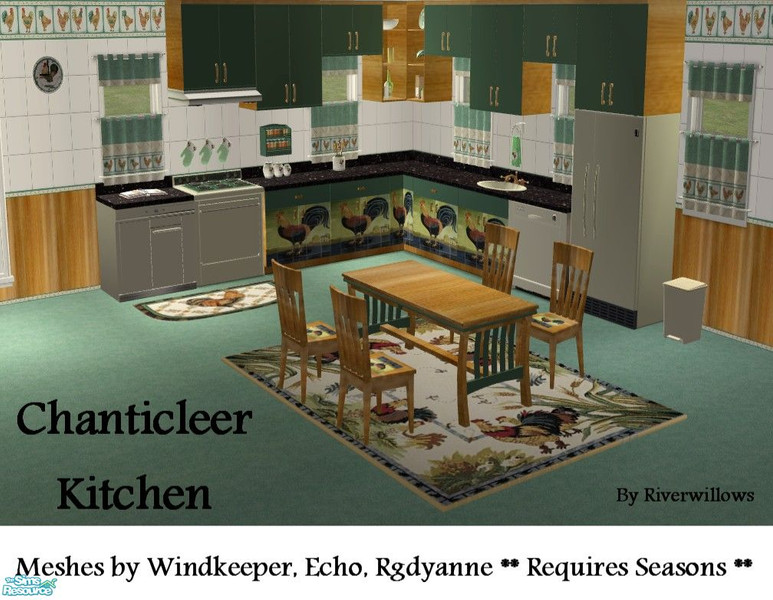 Cute kitchen in lovely greens and honey pine, featuring Chanticleer, the rooster hero of Chaucer\'s Canterbury Tales. Meshes are by Windkeeper, Echo, and Rgdyanne. Some items require Seasons and OFB. By Riverwillows.