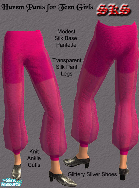 Lovely and delicate these fushia harem pants almost seem powdered with the dust of a thousand garnets. Your teen Sims natural skintone will show through these sheer panteloons. A bit more modest than the adult version featuring mid thigh length pantetts. They shimmer when she shimmies! By: SKS