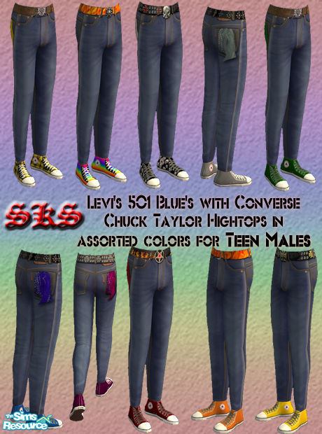 Blue Levi\'s 501 Jeans with Converse Chuck Taylor AllStar Hi-tops in assorted colors FOR TEEN MALES. Tight zoom reveals diagonal denim weave! By: SKS