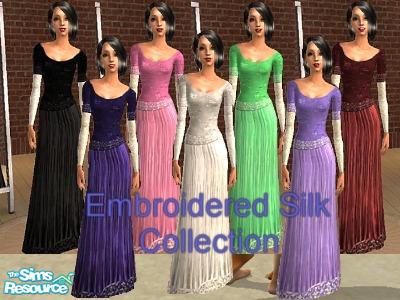 These elegant gowns feature embroidered bodices and shiny satiny skirts. There are seven colours in this set, and a couple more coming soon.
