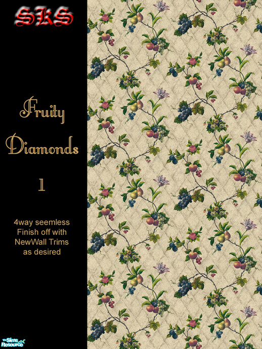 Another lovely old country kitchen wallpaper Featuring assorted fuit and accented with flowers. By SKS