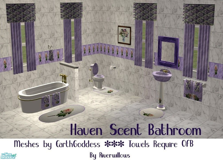 Sweet and lovely bathroom, in white marble and lavender floral accents. Meshes by EarthGoddess. All items base game, except towels which require OFB. By Riverwillows. Dedicated to Callisto for her generosity in a time of great need. Thank you.
