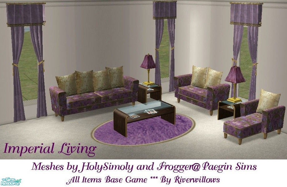 Regal living room set, in royal purples and gold trim. Meshes by HolySimoly and Frogger@Paegin Sims. All items base game. By Riverwillows.