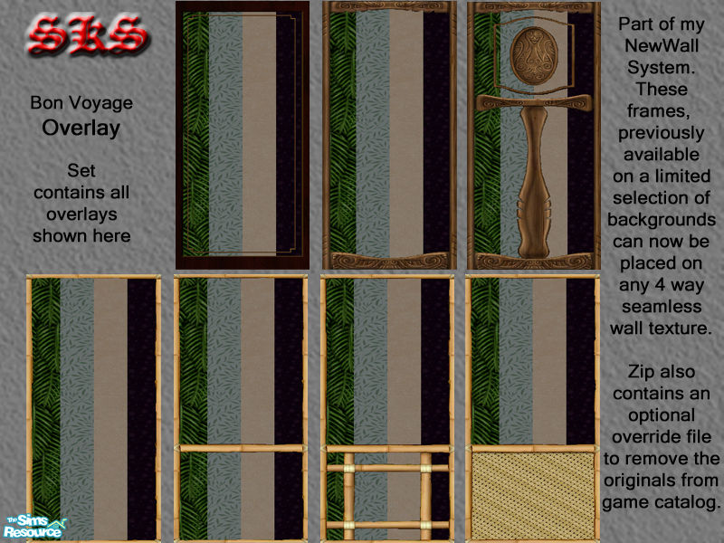 This overlay offers an assortment of Panel Frames taken from Bon Voyage. Now available for placement on any 4 way seamless wallcovering. Zip includes an optional override file that removes the original wall coverings from your catalog, but not the game. By: SKS