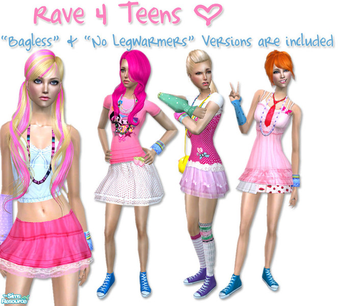 My Rave set converted for teens. Also includes \"bagless\" and \"no leg warmers\" outfits. Have fun!