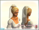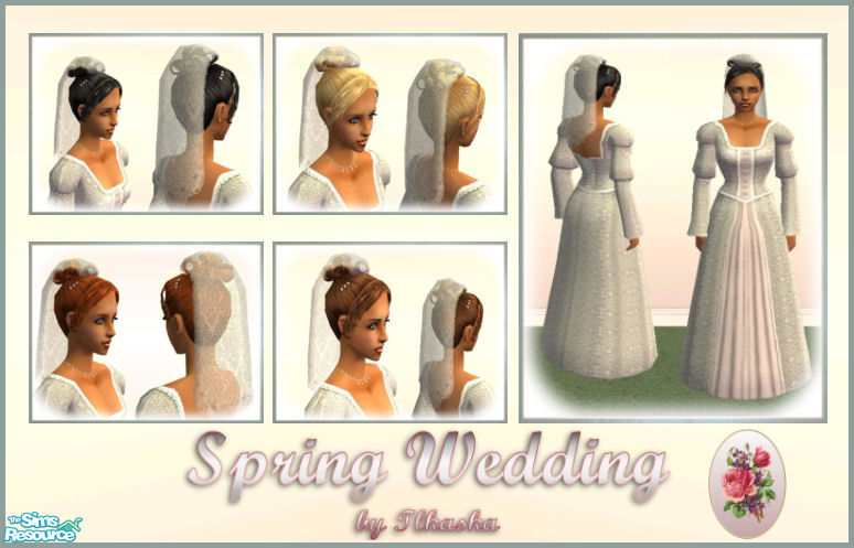 This set includes a white damask wedding gown with soft pink accents and little pink bows down the front. Also includes four color-binned curled-up buns with wavey curls framing face with a lace veil and little pink ribbons as clips. NO MESH REQUIRED (hairstyles require \"Glamour Life\" EP)
