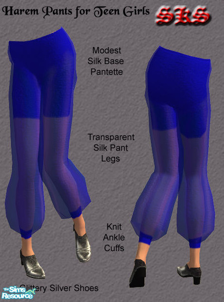 Lovely and delicate these blue harem pants almost seem powdered with silver genie dust. Your teen Sims natural skintone will show through these sheer panteloons. A bit more modest than the adult version featuring mid thigh length pantetts. They shimmer when she shimmies! By: SKS