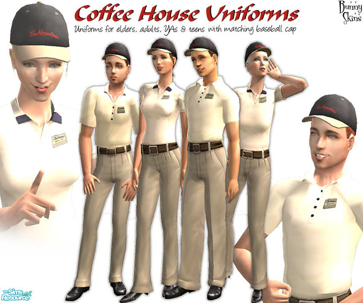 A set of coffee house uniforms for elder, adult, young adult and teen males and females. Uniform comprises short-sleeved cream shirt with name badge worn with classic stone Chinos. Comes with matching baseball cap (which must be downloaded separately). Standard Maxis meshes.