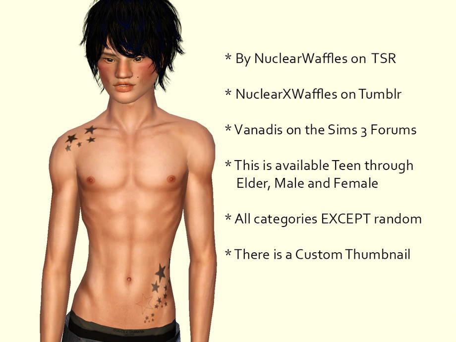 These are star tattoos for (your sim's) right collar bone and (your sim's) left hip going a bit down. They are almost fully visible in a low cut bikini for the gals, and likewise with any other low-cut jeans or shorts for the guys.