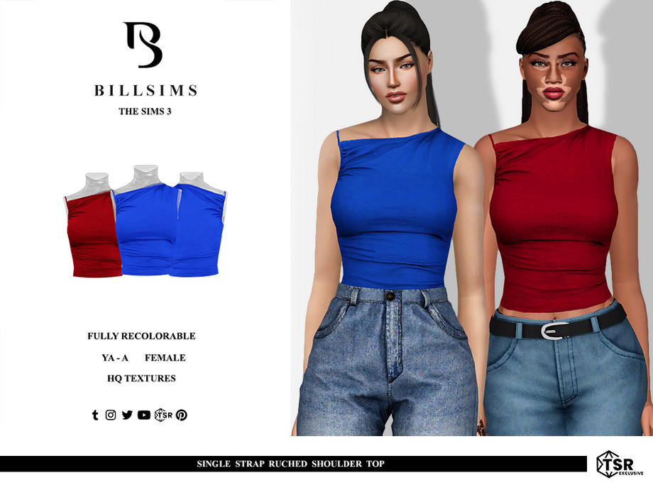 This top features a single shoulder strap design and ruched detailing!