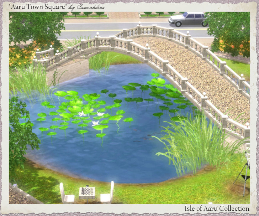Aaru Town Square is a superb location for your Sims to meet and greet others in the neighborhood, or even just to kick back and enjoy the sunshine on their own. With fishing, easels, telescopes, a scenic bridge, and enough chess tables for a chess tournament, there is certainly enough going on at this hot spot for your Sims to be thoroughly entertained and refreshed.