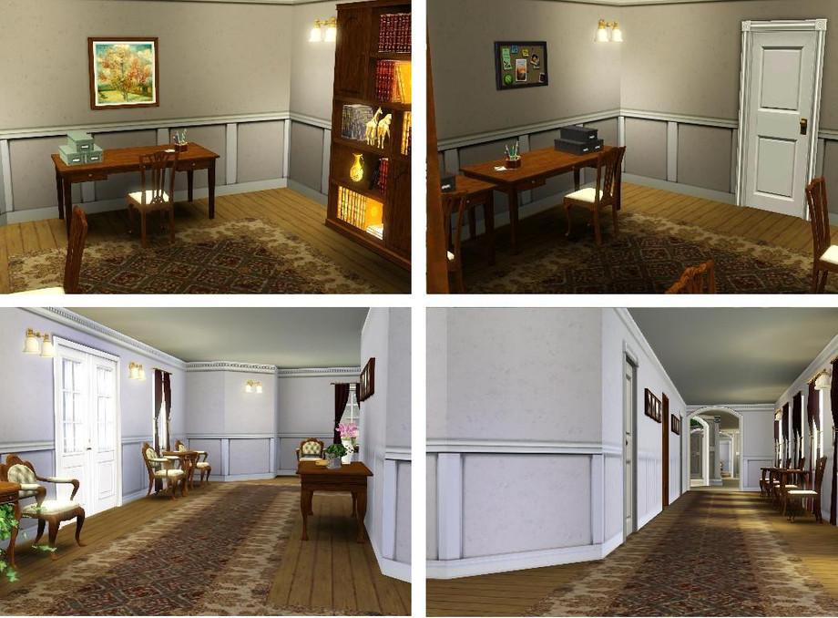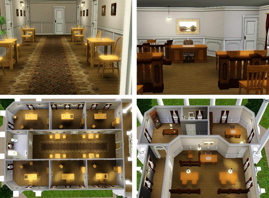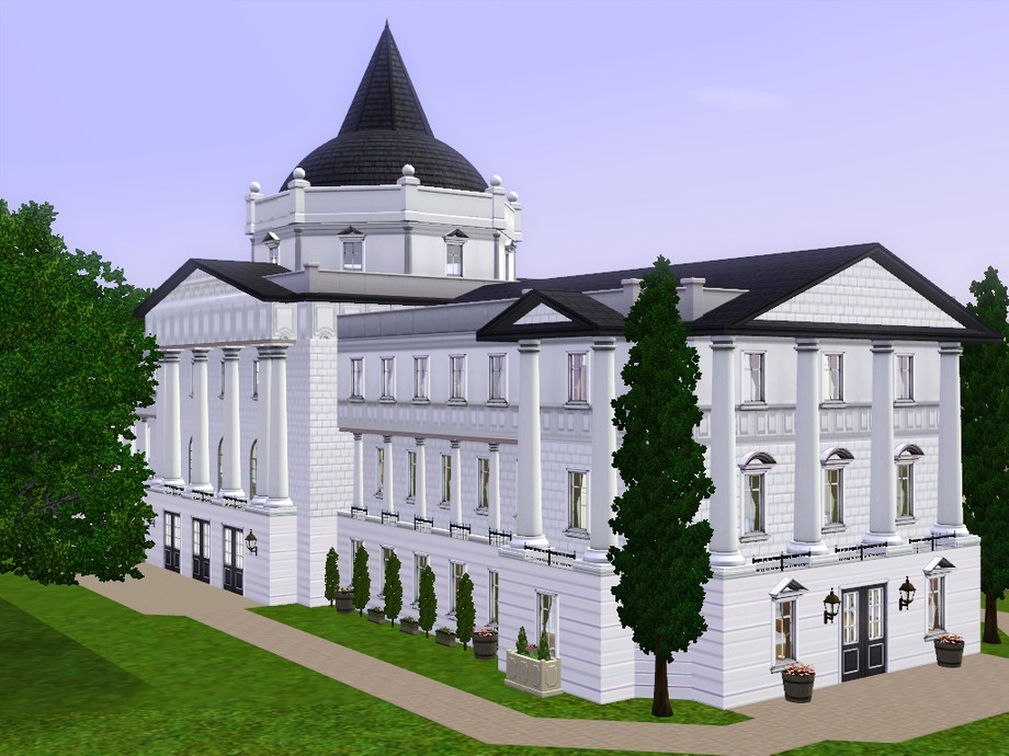 Here is the City Hall to go with my old fashioned community lots. This is lot 5. It was inspired by the San Francisco City Hall building. City Hall features two court rooms on the second floor, complete with judges' chambers. The first and third floors hold offices for city workers and lots of places for sims to sit and wait! Much of the custom content listed above is decorative, so you could choose to decorate it with your own items if you wish. Make sure you get the windows (get the whole set), door, column, stairs and railing, sidewalk terrain and custom rabbit hole rug. Those are all required.
