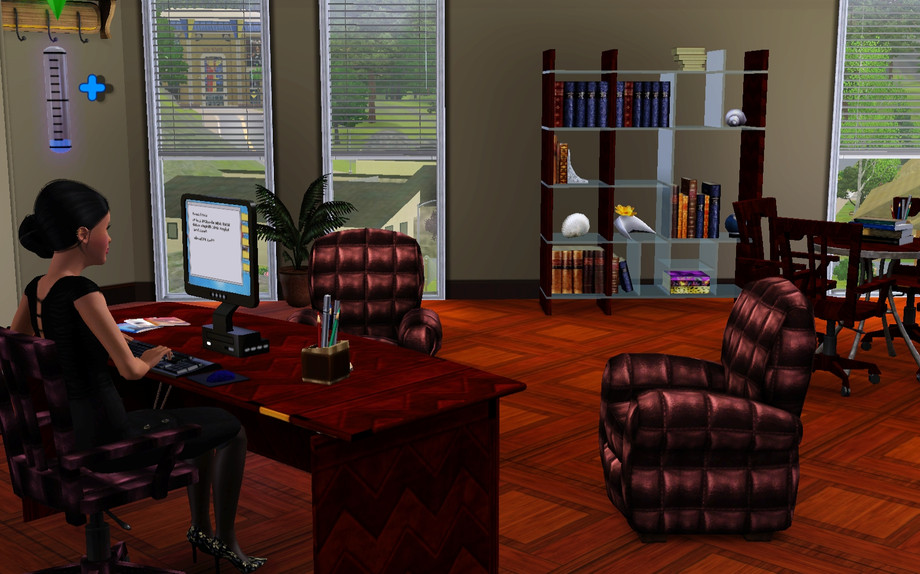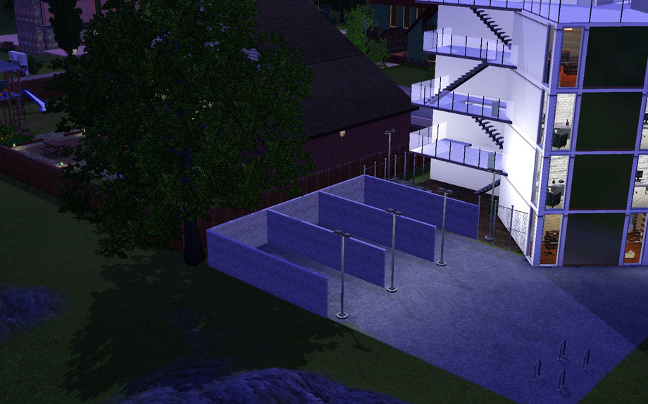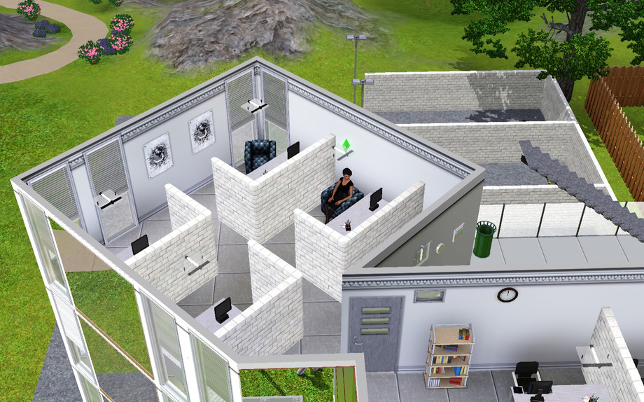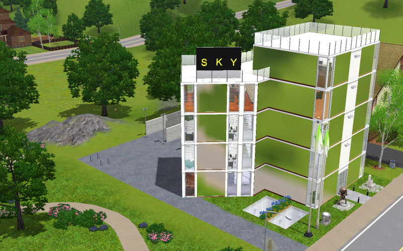 The one and only town's Skyscraper with mirror exterior, parking lots, fire escape, lobby, cubicles, conference room, president's top office.