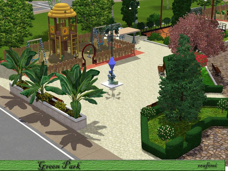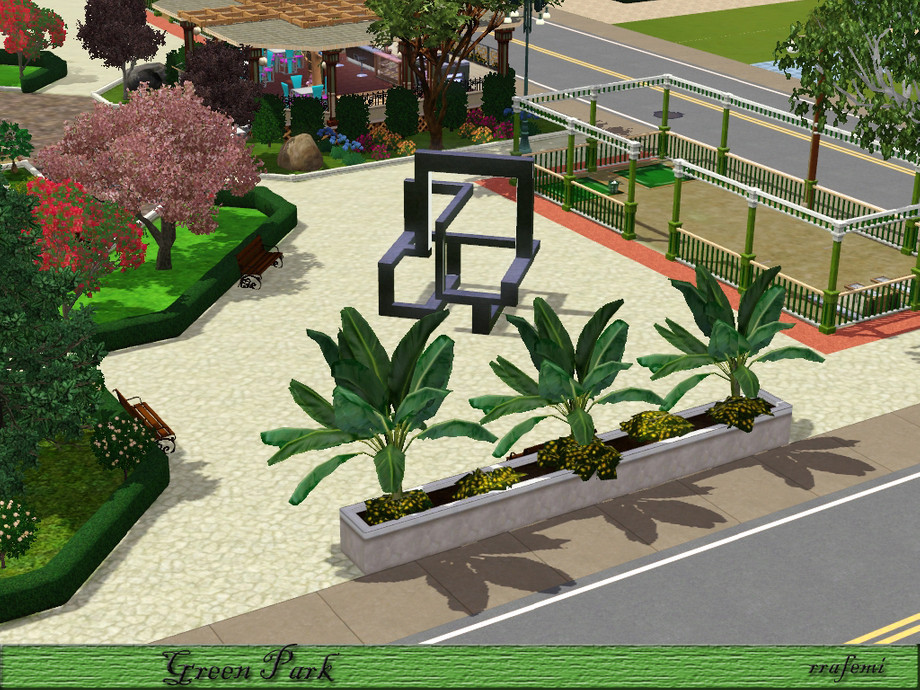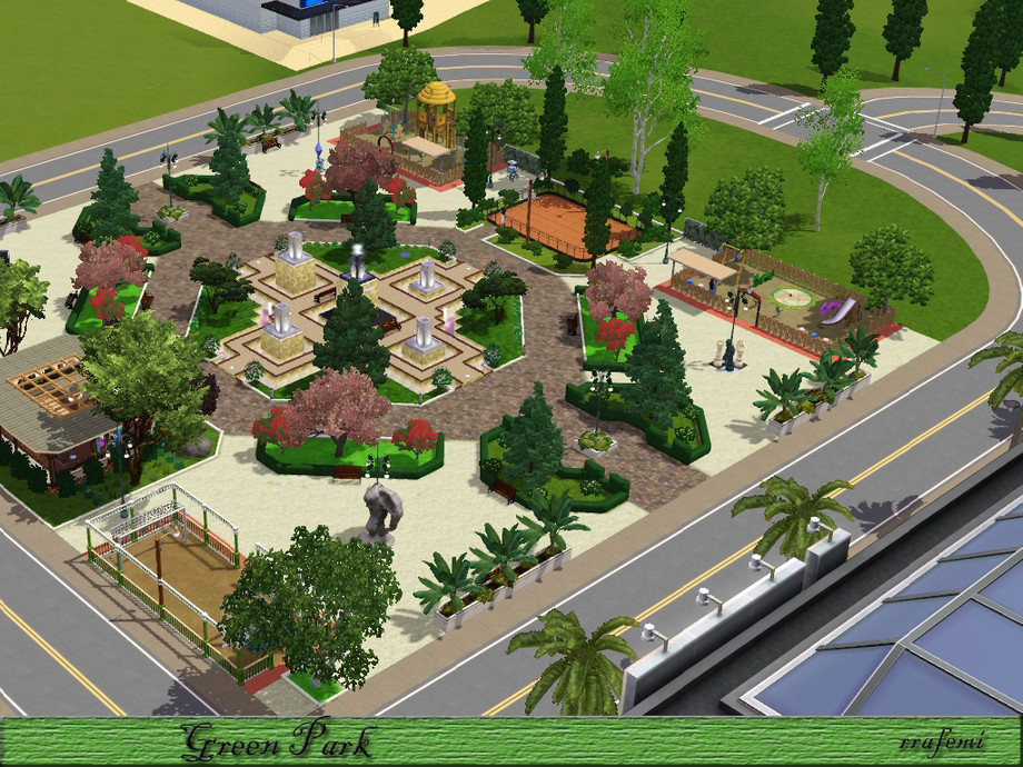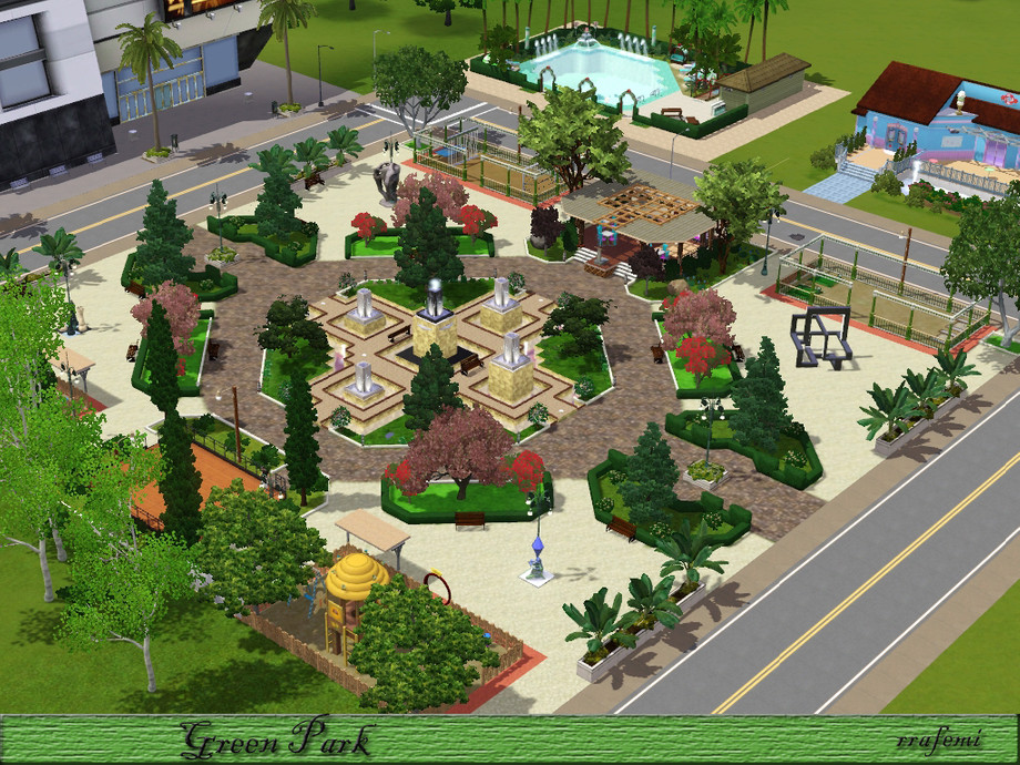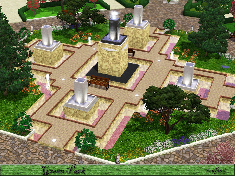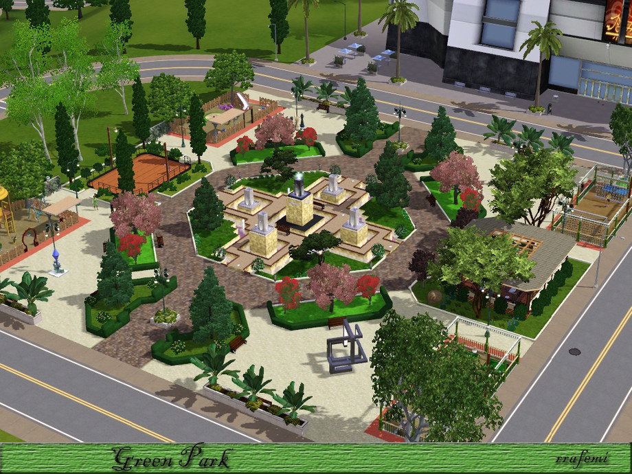 Green Park is a large park where all the sims will have a pleasant time. Children can have fun in the two playgrounds, adults can stroll through the gardens with trees and sculptures and the young people can skating, playing soccer or practice golf. And In the center there is 5 modern fountains at different heights surrounded by a ponds