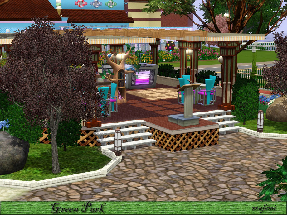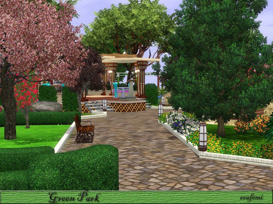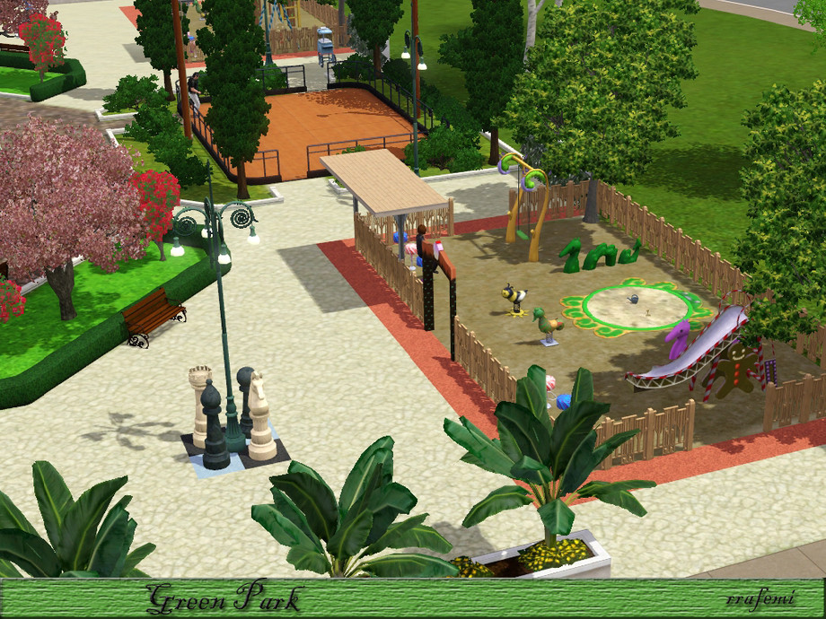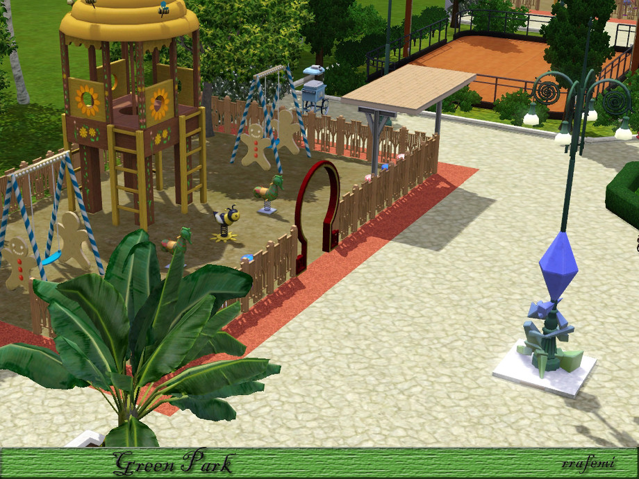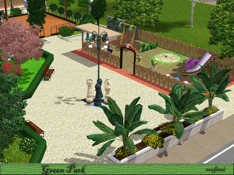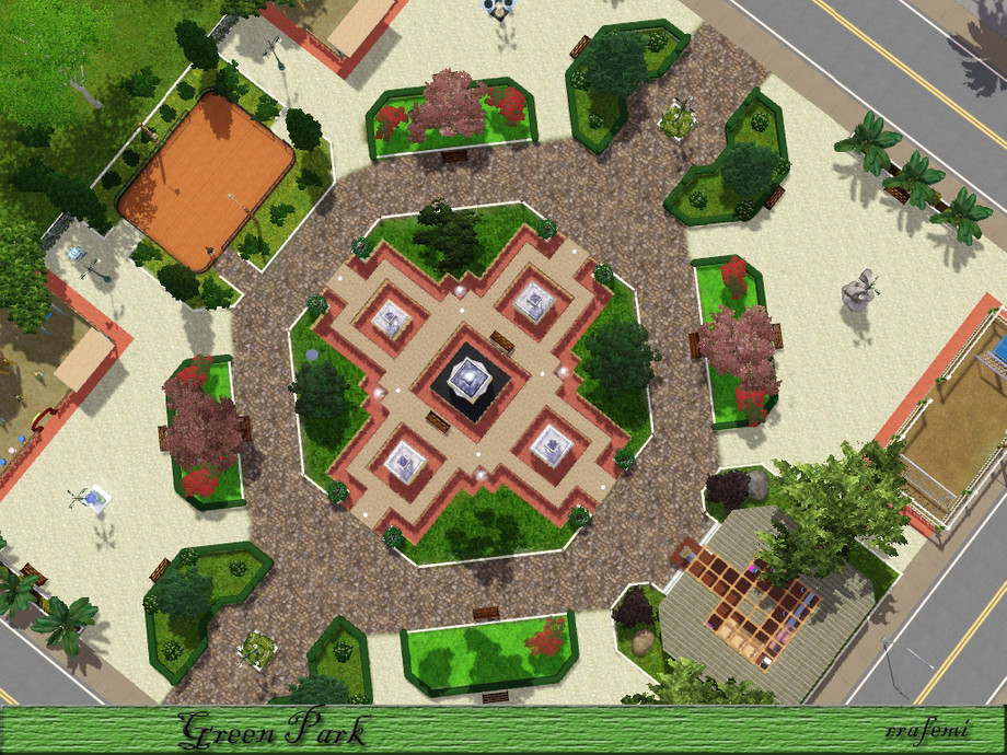 Green Park is a large park where all the sims will have a pleasant time. Children can have fun in the two playgrounds, adults can stroll through the gardens with trees and sculptures and the young people can skating, playing soccer or practice golf. And In the center there is 5 modern fountains at different heights surrounded by a ponds