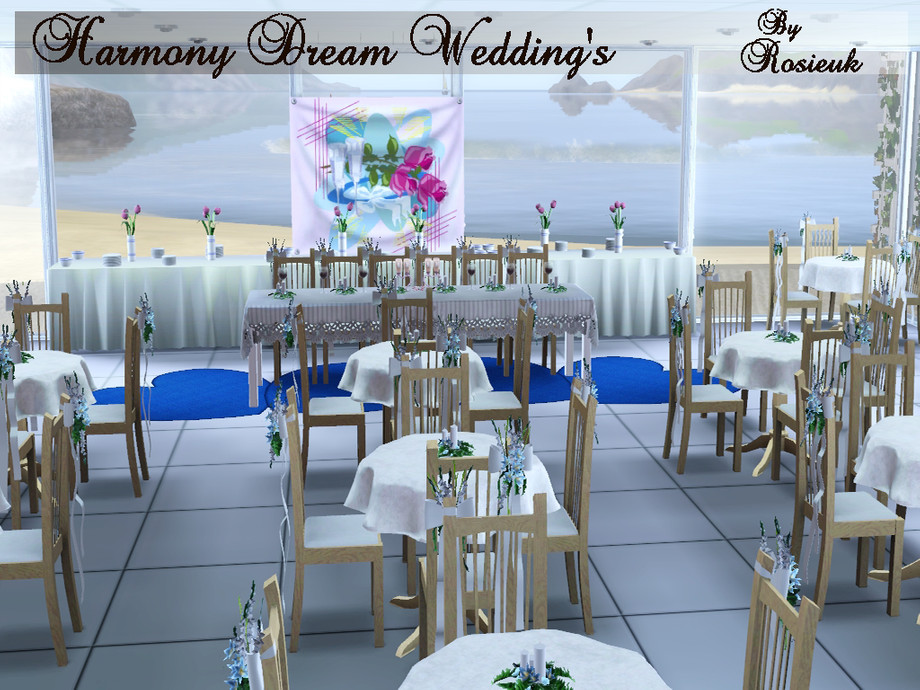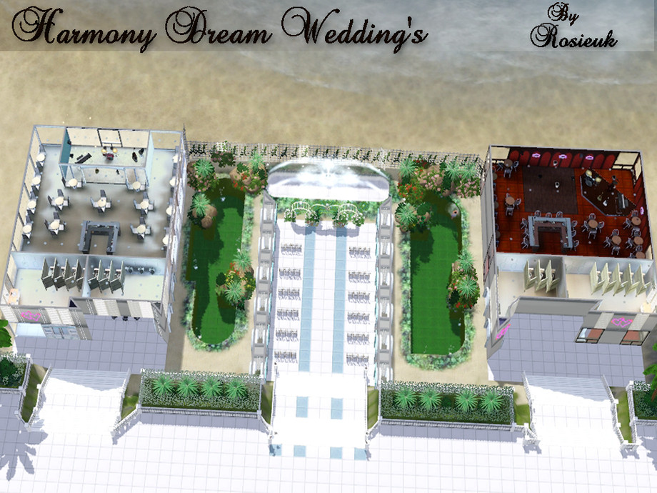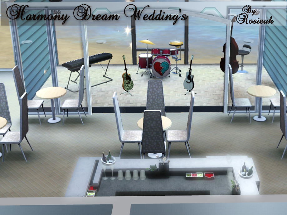 this has everything for the sim's who are thinking of begining a new life together, you have a wedding ceremony area with seating for all the family's, there is a wonderful big room for that much needed lunch, a bar,and band area toilets, all on the upper floor, for the younger sim who are old enough to drink there is a bubble drinking machine in the entrance, when the night draws in there is your own night club where you can dance until the sun comes up.