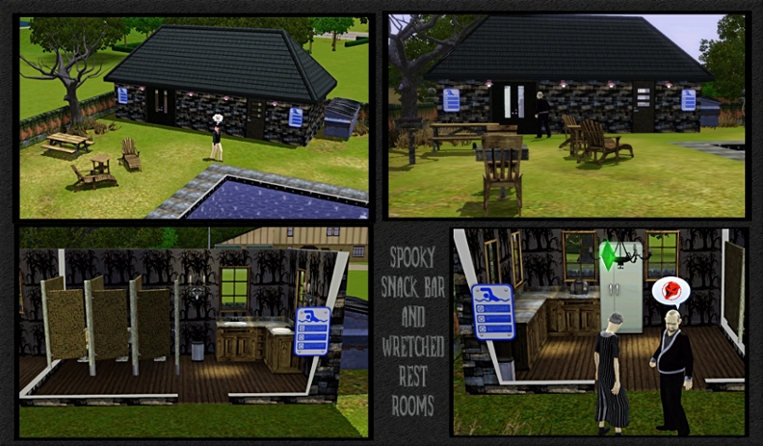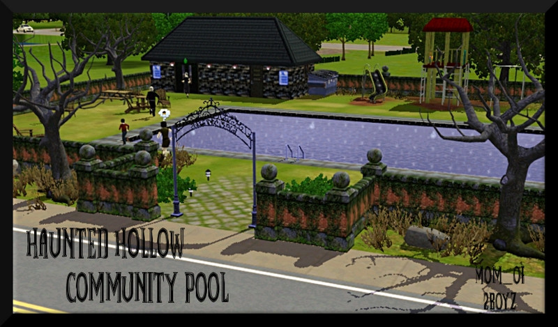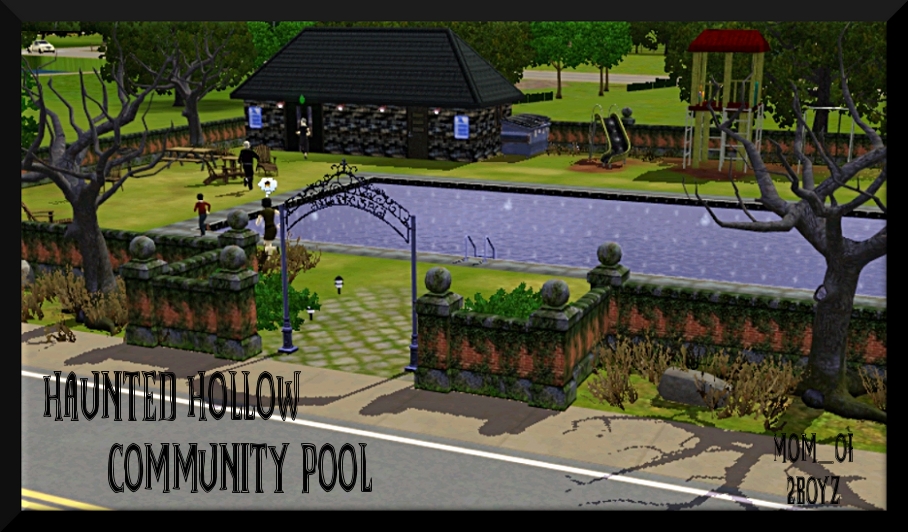 Haunted Hollow Community Swimming Pool...rusty metal, splinters and enough lead-based peeling paint for all.It features a huge swimming pool, a play area for the children, a picnic pavilion in the corner and a few rusty grills around the lot. There is also a snack bar and restrooms on the far side of the lot. For those who choose not to swim, there is a chess table on the side by the snack bar.