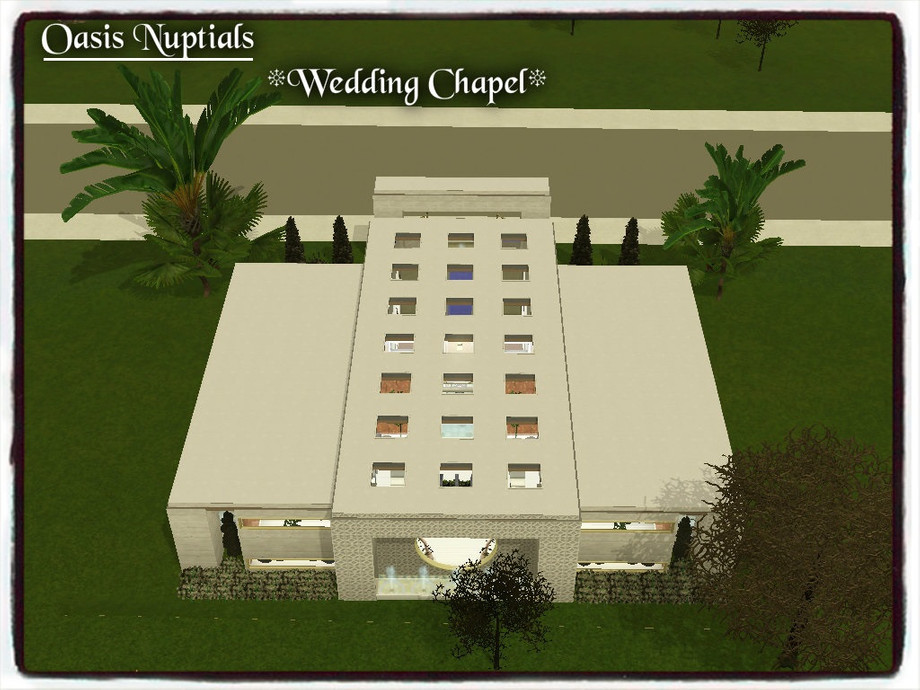 This Wedding Chapel was made in Oasis Landing, but can be placed in any town. It is also 'Visitors Allowed'. It has a Wedding area and 2 dining/reception rooms. No bathroom on this lot, but can easily be added. I hope you like it!