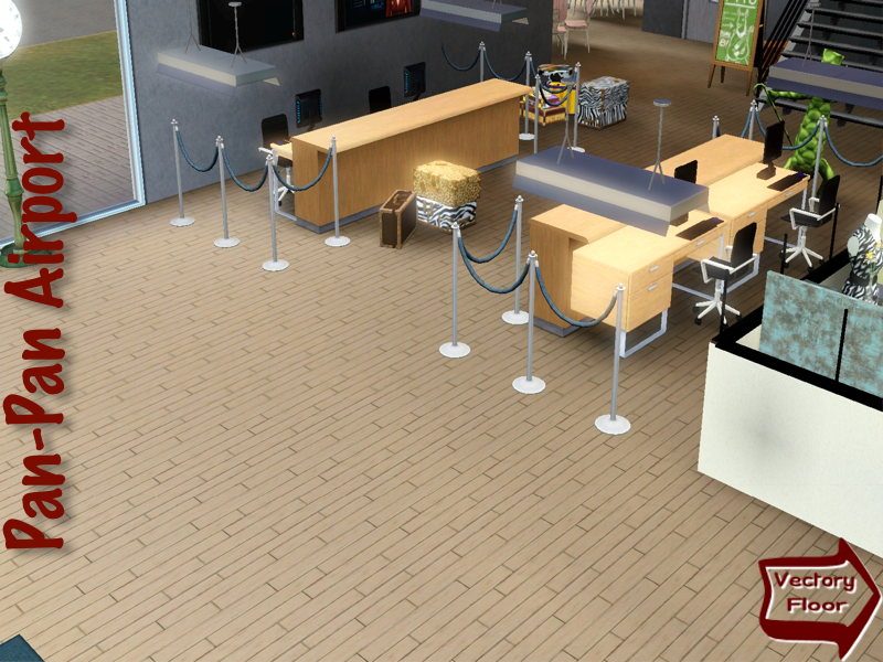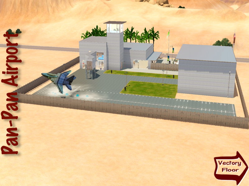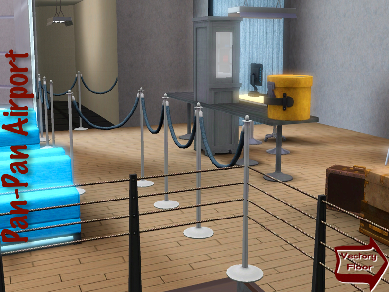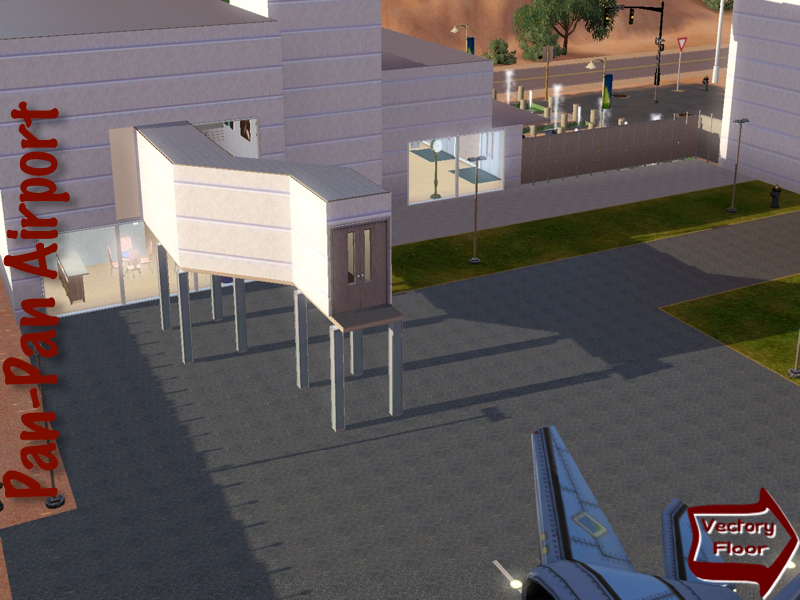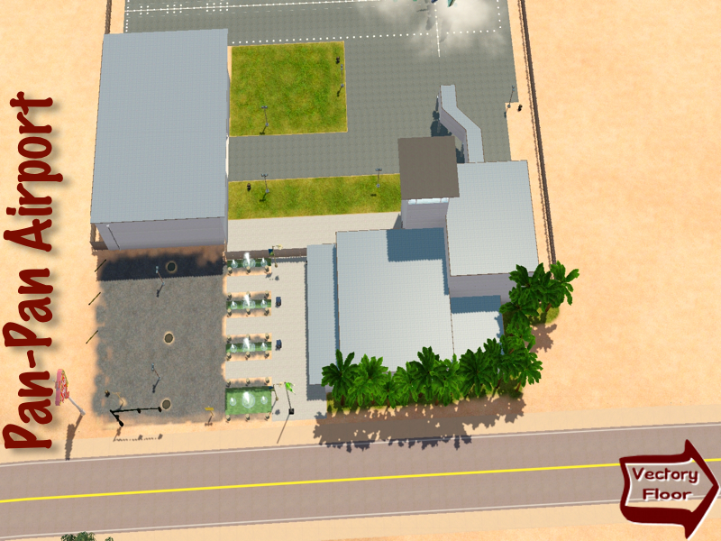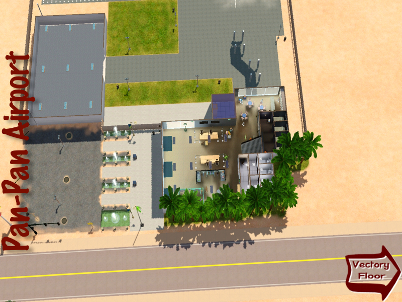 Made by Vectoryfloor; A fully equipped airport, with two restaurants, flowershop, boutique, small motel, check-in area and customs.I've build this in Lucky Palms, 228 Sedona Lane, next to the windmills, on a large lot, 64 x 64. I've set this lot to Art gallery. That may sound weird but I wanted sims to come and take a look around. When set to a gallery your sim will start to wander around and view everything in the building.