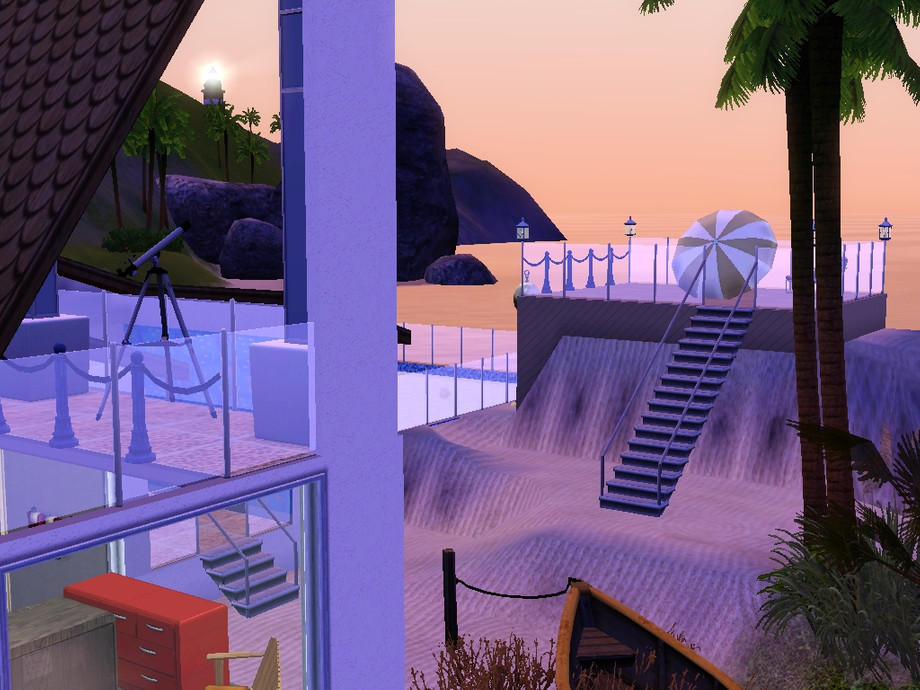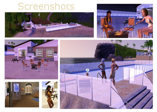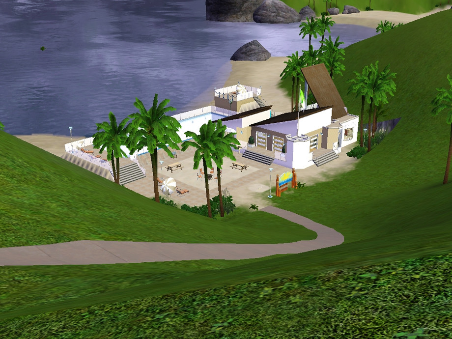 A swimming pool right there at the beach! Timid swimmers or children may enjoy it for its peaceful atmosphere. This pool, however, is open to the ocean and therefore gets refreshed. The area nearby is just gorgeous! Lots of swaying palms, bright blue sea meeting the horizon, and throngs of interesting sims walking by. At night coloured pool lights are lit, great for a party or a quiet romantic swim with the moon shining on the still water.