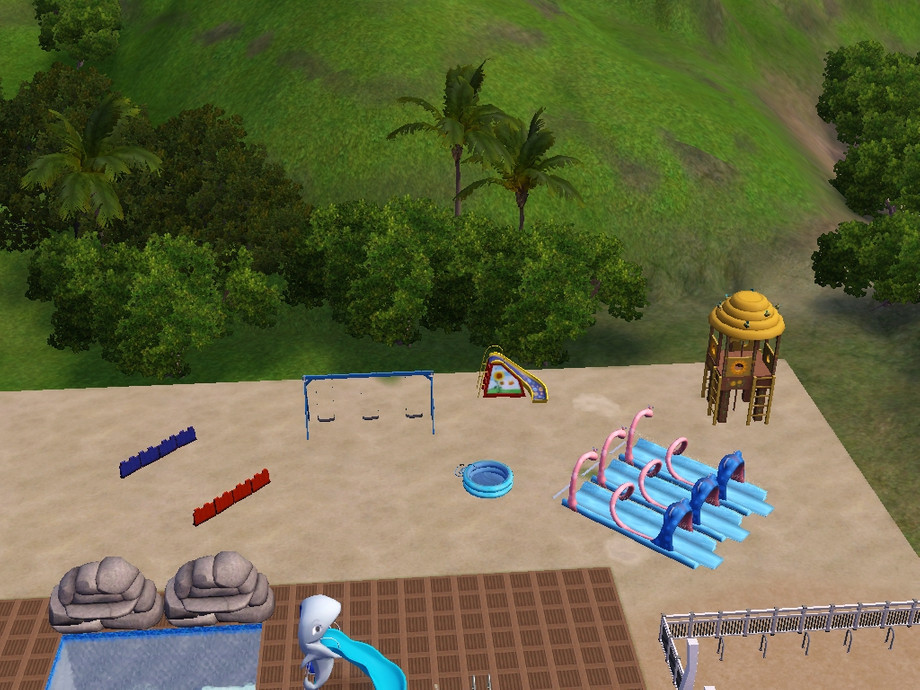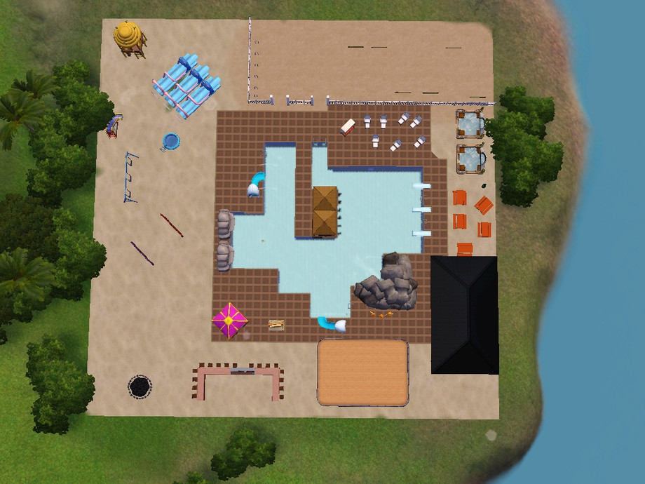 water park with big pool with plenty of activities for the kids, also a bar for the adults in the water and on the sand while the kids hangout and go crazy. I made enough empty space for sims to relax on beach towels and get tan.
