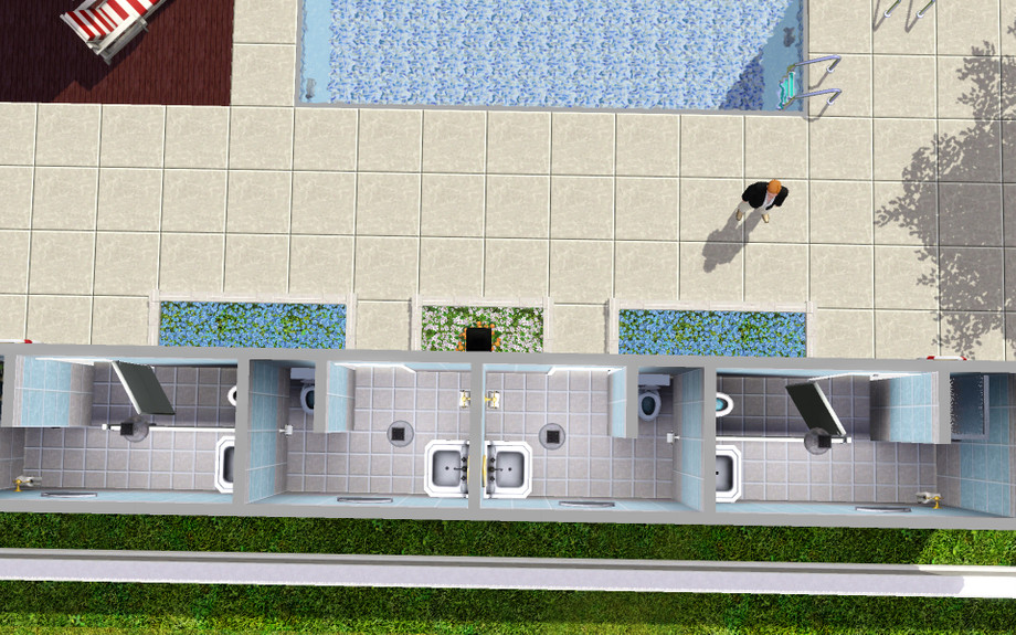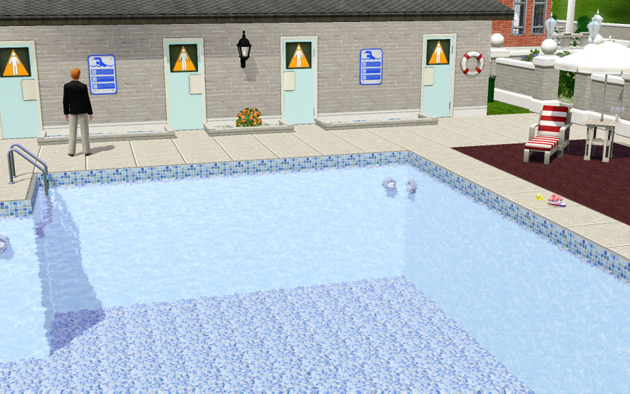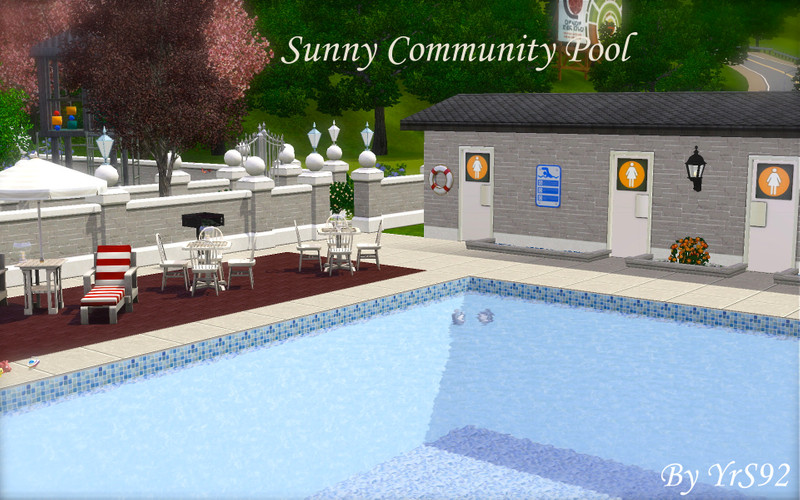 Sunny Community Pool is a family friendly poolside. Forget those excited, noisy pools where other sims have had too many juice shots and lead your family to Sunny Community Pool for a peaceful afternoon. Safety comes first so no running around the pool is allowed!
