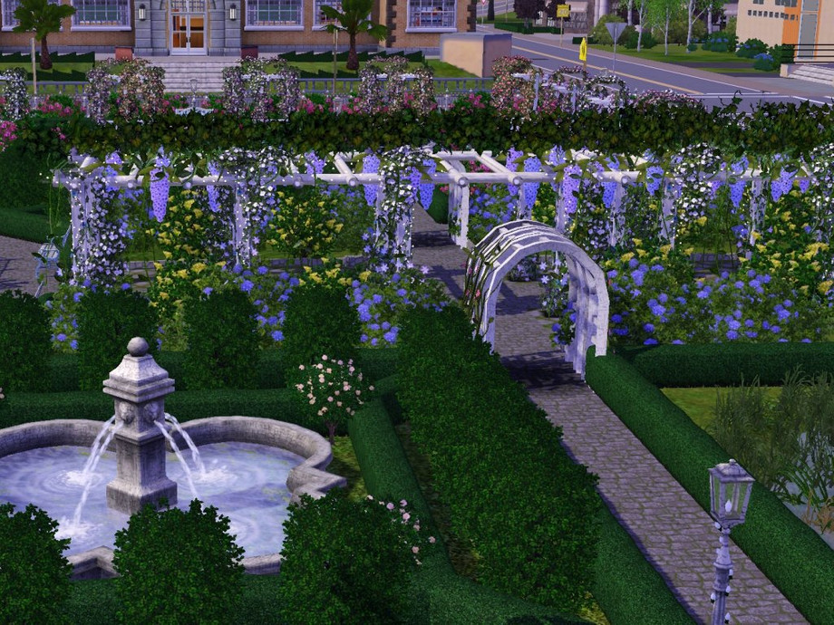 The park bench around the cherry tree is only decorative and cannot be sat upon. The wisteria pergola is only decorative and cannot be walked under except through the path that passes under it perpendicularly.
