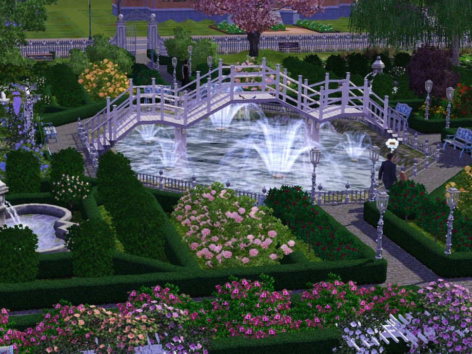 Victorian park: gazebo, conservatory, rose garden, English formal garden, 3-arch Japanese bridge, wisteria pergola, fountains, ponds, playground, picnic area, fire pit, juice bar, hot dog stand, outhouse