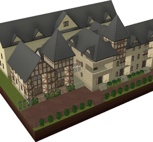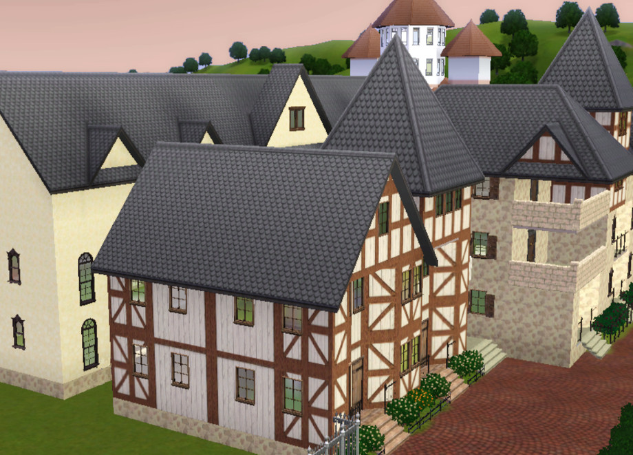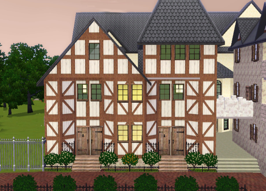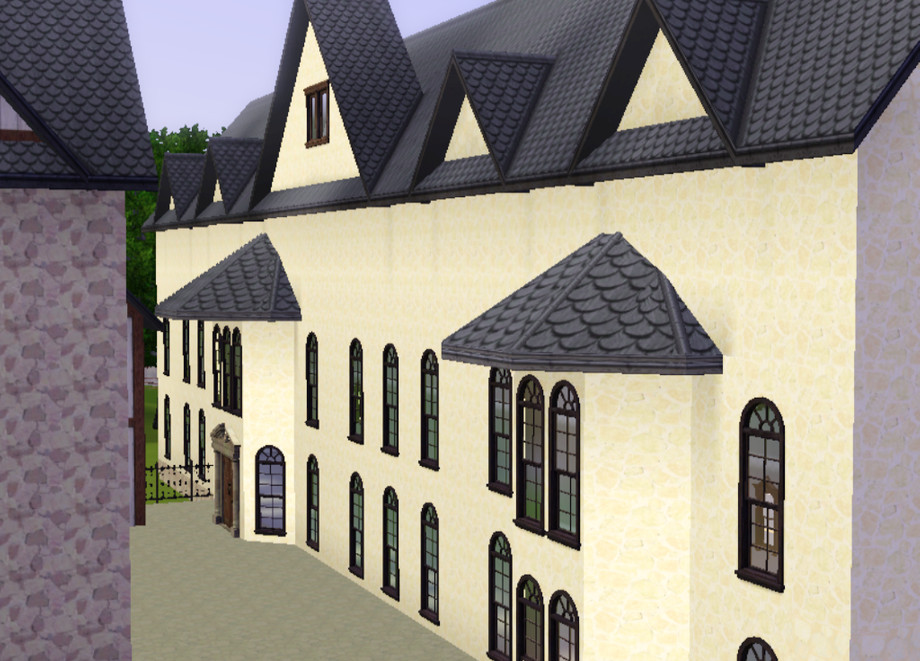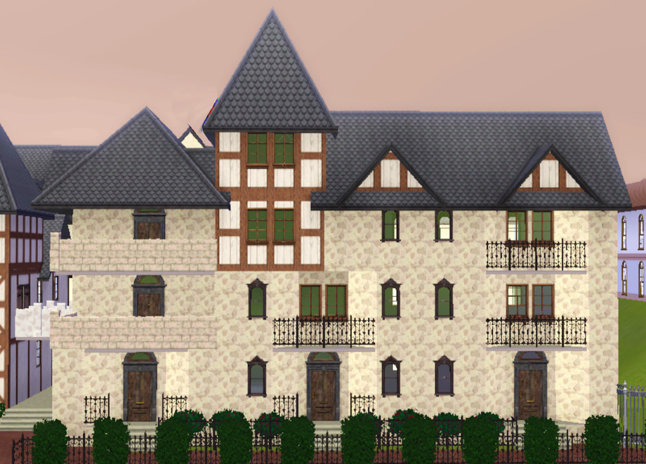 Hi =) The lot has three "houses" in it. The building on the left has an older style than the two others, more medieval, and it is two floors high. The building on the left is more romantic and has three floors. The back building makes me think about a school for girl and it is three floors high. The whole lot looks like it has been built in the 1800s and it make me think about France, old France. And even if it is old, it looks romantic.