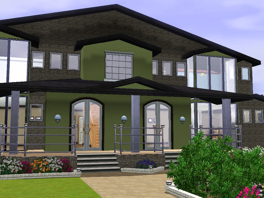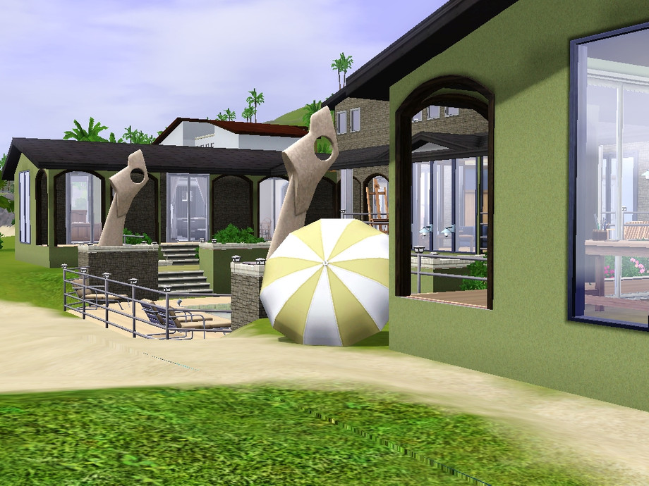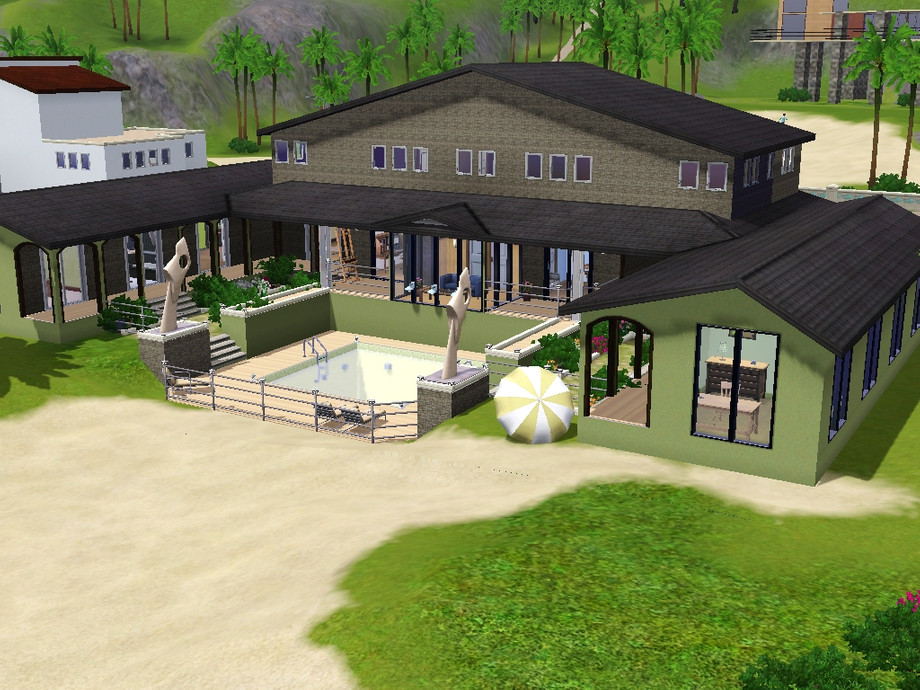 A modern-ish mansion with outdoor pool and courtyards. 3 bedrooms, two bathrooms, formal and casual dining, office and reading room, lounge/living plus empty spaces upstairs for expansion. Fully Furnished (apart from the upstairs part): 136, 000. Thanks to evi for her brick pattern.