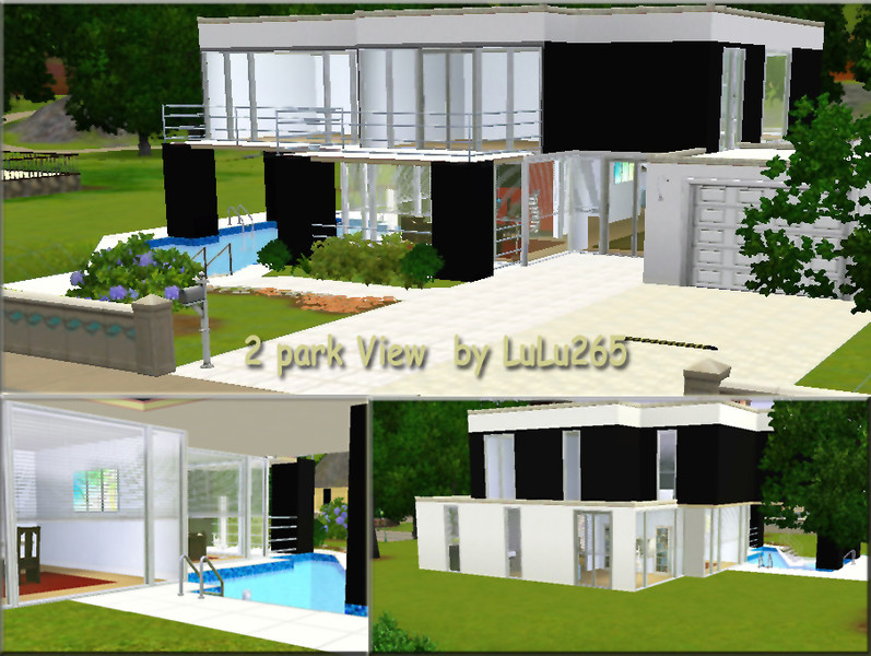 A modern home for your Sims. Downstairs is a sitting room, dining area, kitchen, study and small bathroom. Upstairs are the bedrooms and 2 full bathrooms. A garage and large pool complete this home. This home is furnished downstairs using Maxis only.. The bathrooms upstairs are complete, but the bedrooms are unfurnished.
