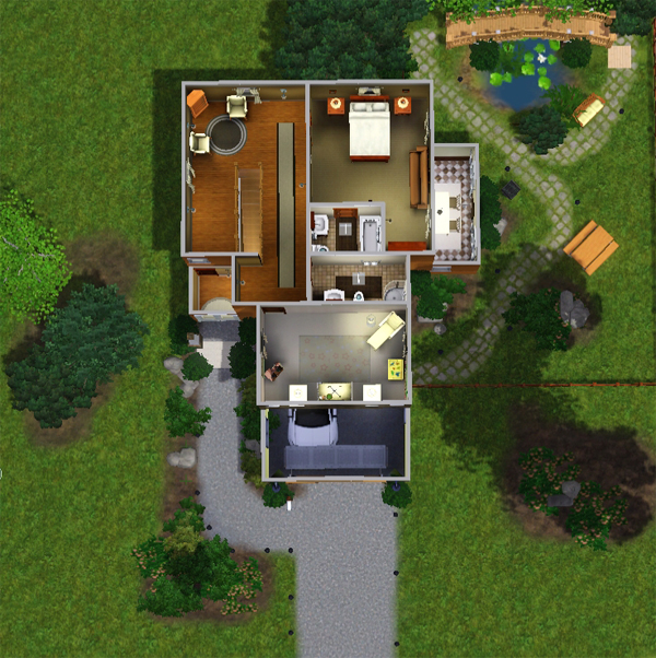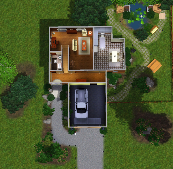 This mountain inspired suburban home is a two bedroom, mid sized family home. Fully furnished, beautifully landscaped and base game compatible with no cc. Room for a laundry room and, as always, there is ample room for expansion. Fully furnished in deep browns and fine woods, you wouldn't expect the bright and modern kitchen =) Enjoy !