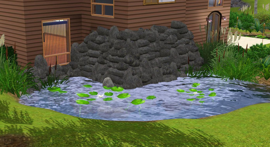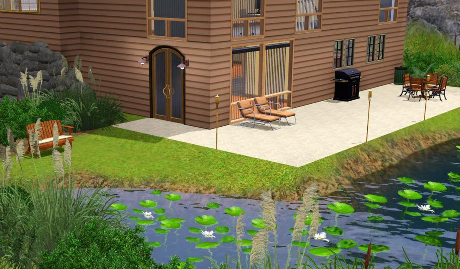 This contemporary 2 level home features a wonderfully private yard without intrusive and ugly fencing. A lush green belt keeps prying eyes and wandering sims out while giving the occupant the feeling of being in nature....of course, having a moat around half the house doesn't hurt either!