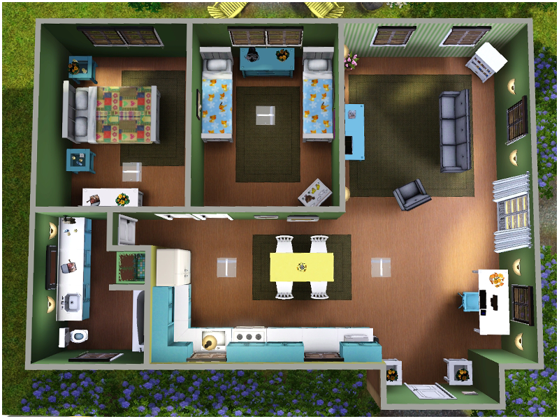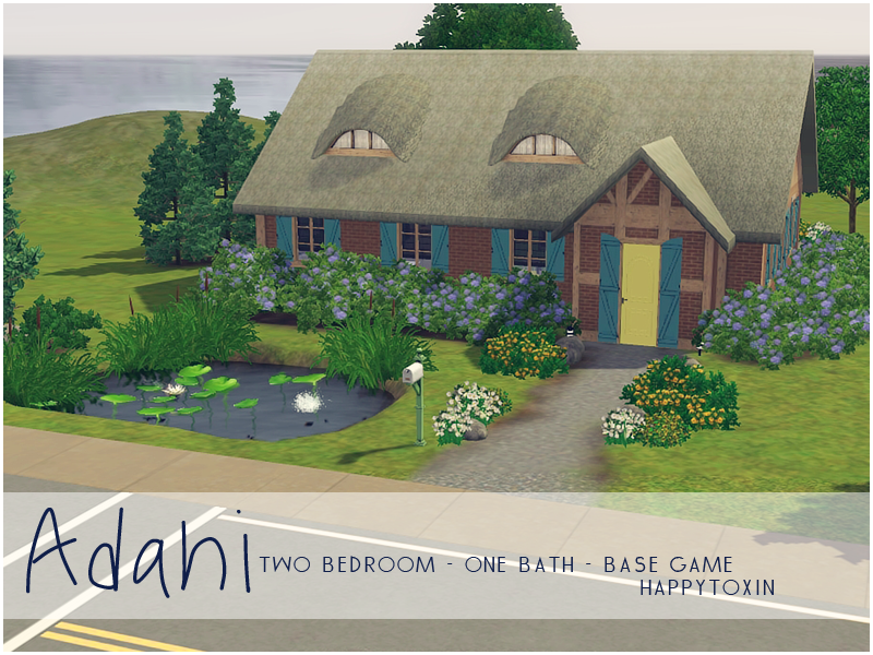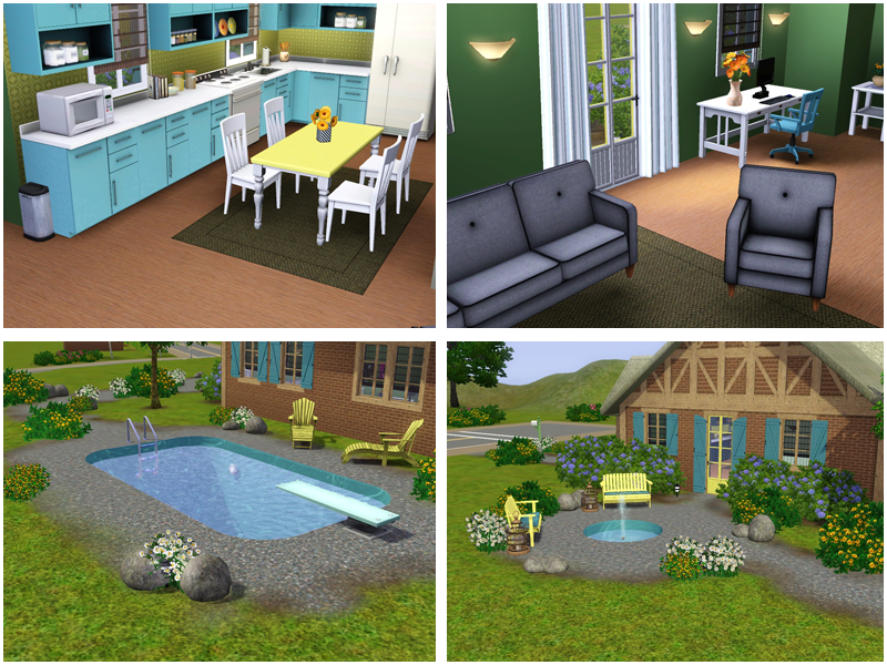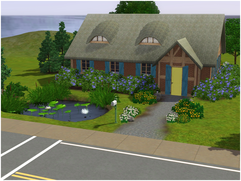 Sometimes a Sim just wants to get back to nature - and this is a great home in which to do so! Plenty of trees and flowers surround this cute little cottage. There's a pond perfect for fishing in the front yard, a small pool in the back, and a lovely little fountain in the side yard. There's no lack for outdoor seating, so your Sim can relax while enjoying the yard. But the outdoors aren't all this home has to offer. Two bedrooms, an eat-in kitchen, bath with tub and shower, and a living room with study nook are all your little family need. This home is decorated in plenty of pastels, for a soft but bold look.