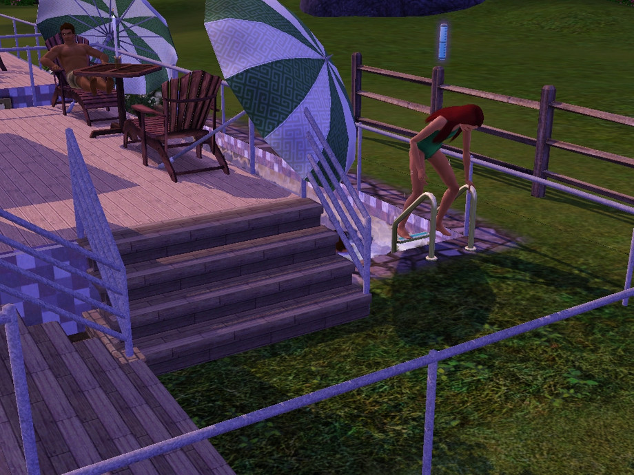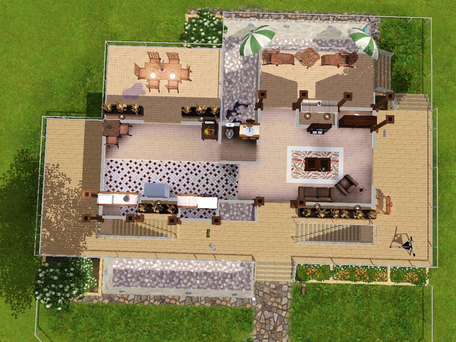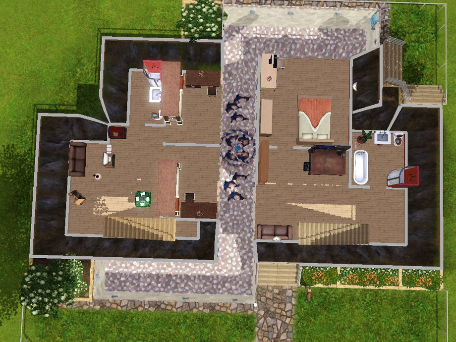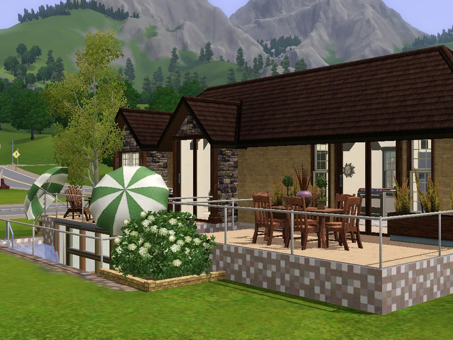Three decks with outdoor dining, play, and skill areas and a wraparound pool. The master bedroom and kids bedrooms are in the basement, each with a den/study area and underwater windows. All living and dining areas give the well decorated moodlet.