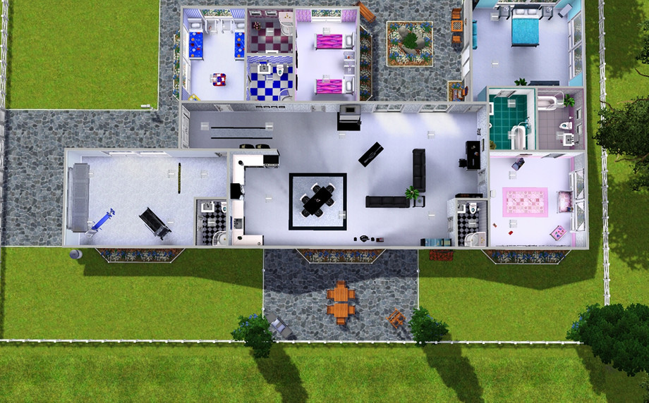 This stunning low set home offers plenty of room for the large family to live, work and play. Dad can work out in the gym (in the garage), mum can relax in the beautiful courtyard complete with fountain, and the kids can play on the state-of-the-art playground. I have used this home in-game with a large family of 8 (3 adults, 1 teen, 3 children, 1 toddler) and there is plenty of room for everyone to follow their own traits.
