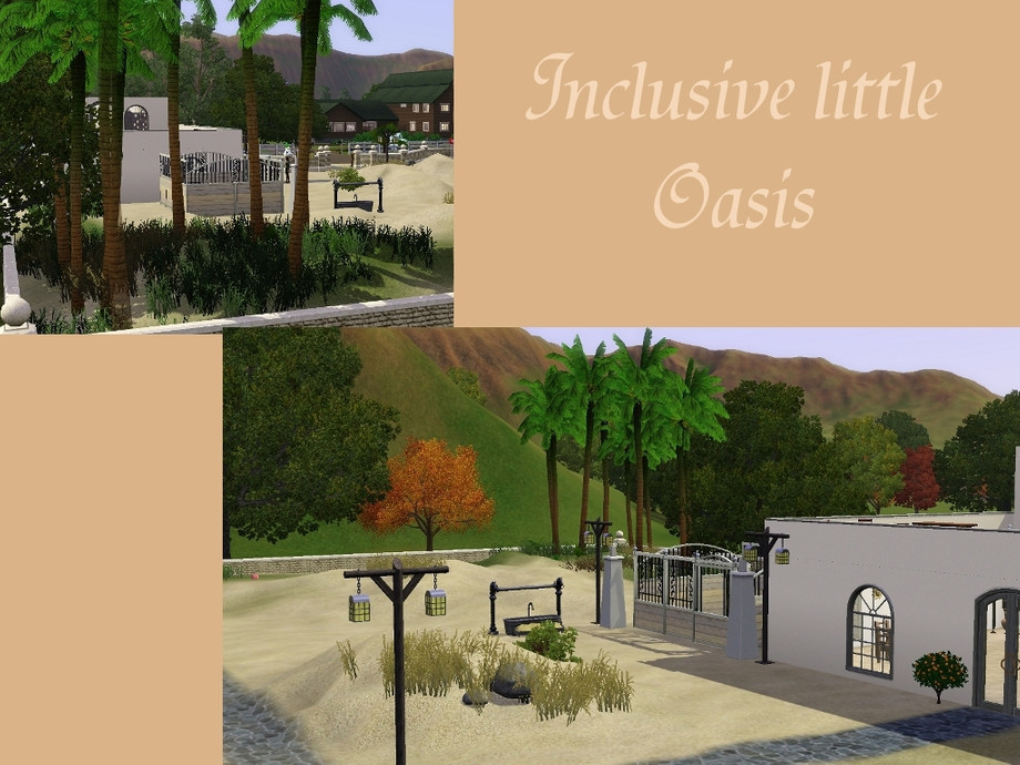 The outside is landscaped as a desert with some dunes. In one corner, you can find a little oasis.