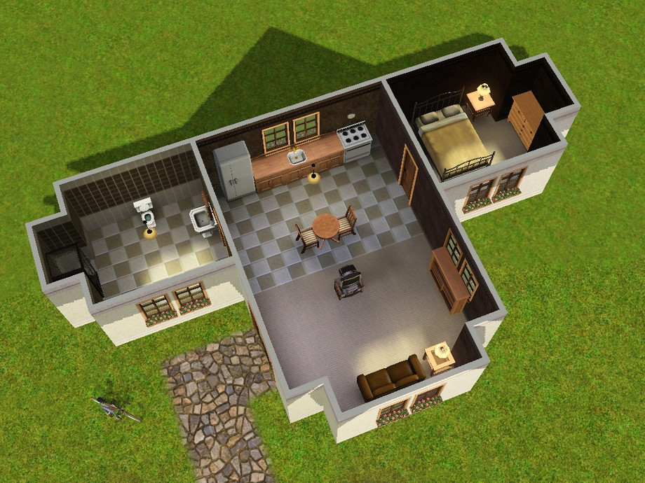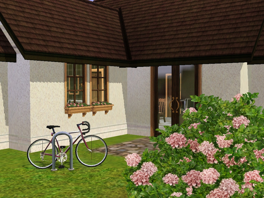 A quaint home for a sim who's just starting out. It's fully furnished with an open plan Living/Dining and Kitchen, plus it has one Bedroom and a Bathroom. It even has a Bicycle on this 30x20 lot.