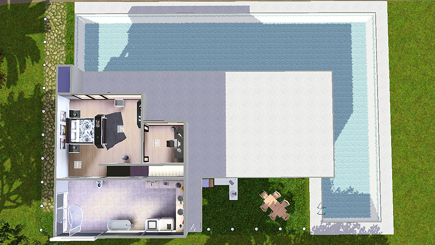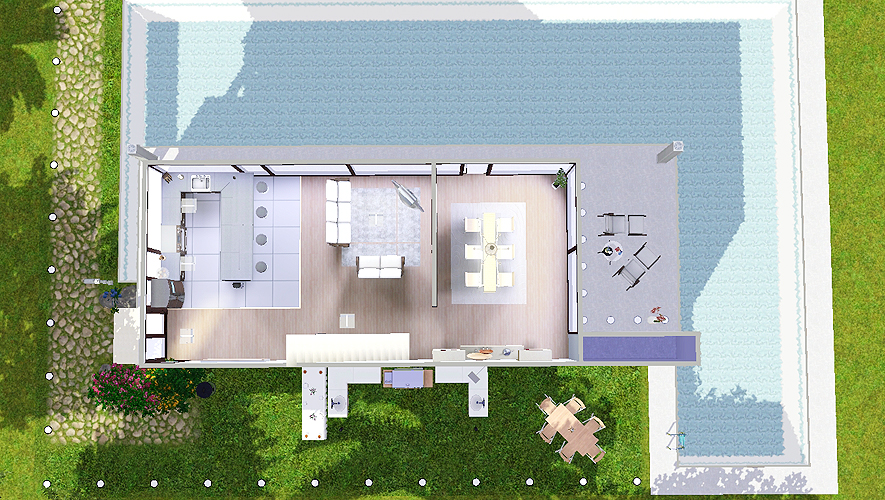 Ashley has a huge pool going half around the house. Its entrance is on the side and leads you directly into the huge, open room that houses the eat-in kitchen, the living room and a somewhat seperate dining area you can use when you have friends over. There's also a door which leads you to a small terrace where you can chill and watch your neighbors.