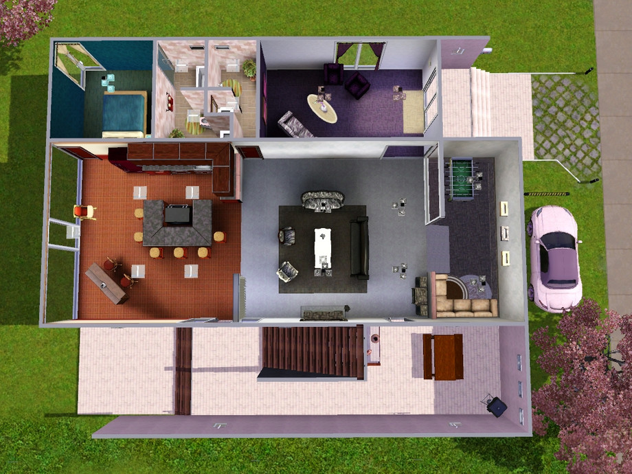 Furnished with combination of colors to match each and every personality of your Sim, this house just have it all. Externally furnished with delicate pink feminine touch, this small sophisticated house has: