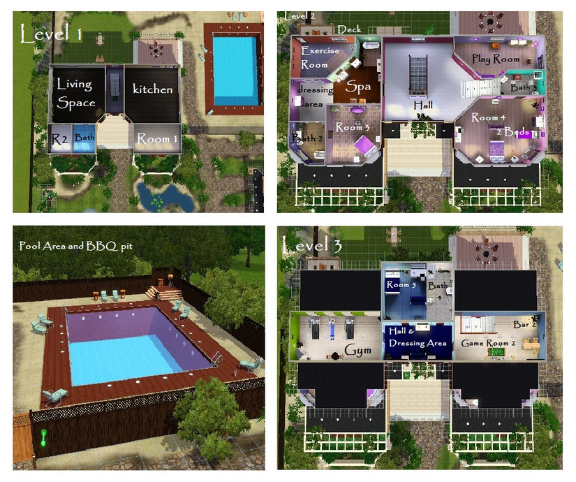 This is a perfect escape house for your sims and their families to vacation in. This home has three levels of fun and bueatiful decor. Beach Escape includes 4 baths and a spa, extra large kitchen area, large living space, 4 beds, up to seven possible if you choose, large pool area, picnic area, backyard tikki bar, 2 bars in total, gym with partial kitchen, garage with library and seating area, bike storage, mini pond, and much much more!