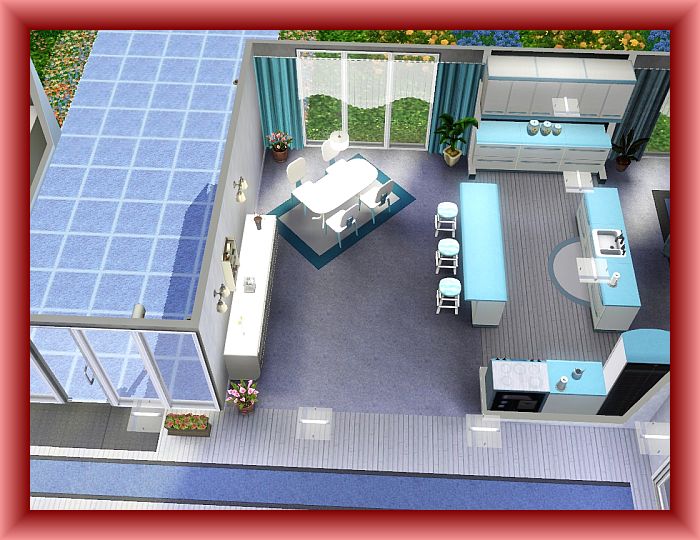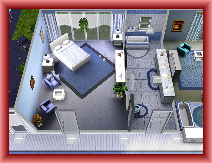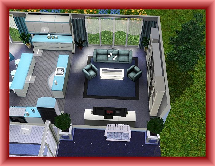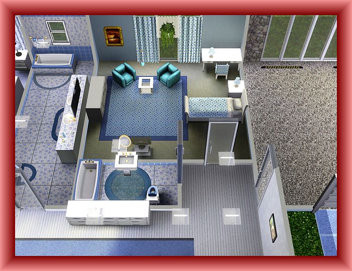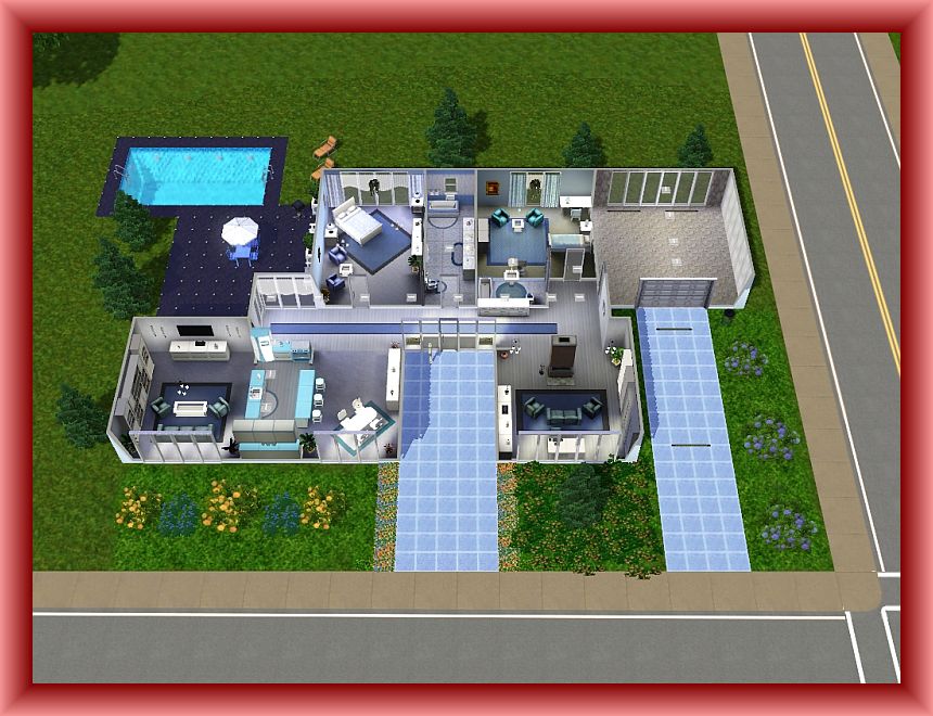 Large and luxurious home for the rich Sim-family with 2 bedrooms, 2 bathrooms, and a bureau with fireplace, as well as a nice terrace, a swimmingpool, a double garage and 2 parking areas.